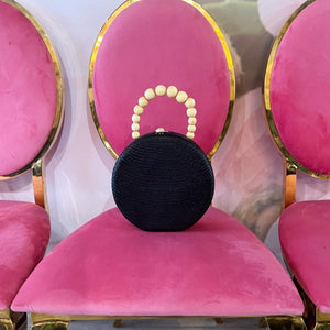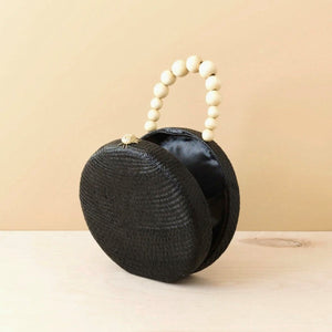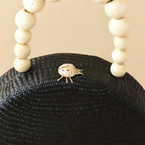 Our Handwoven Round Handbag in black, embellished with a gold-plated ladybug, is a classic! Perfect from day to night, accented with a hand-carved wood bead handle. It's sure to make a statement wherever you go!