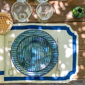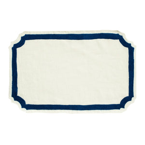 It's the beauty of the old linen and heavy sheets of our grandmothers that inspires this collection of embroidered wool placemats cut out in a beautiful natural linen, decorated with an embroidered navy frame of color.