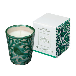 The Pelargonium scented candle diffuses a delicious summer scent. Nestled in the famous hand-painted earthenware pot with the now iconic traditional Iberian motif - a bird in the middle of foliage. It evokes a garden of fresh perennial herbs and takes over the geranium, the star of balconies and terraces, chosen here for its mentholated notes.