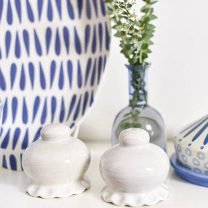 Cet ensemble salière et poivrière à volants f Découvrez les coups de pinceau peints à la main, un accent de volants en bas et un petit design rond qui fera de n'importe quelle table la vie de la fête. Ils conviennent à un roi ou une reine ou à un décor décontracté sur votre table à manger tout au long de l'année.